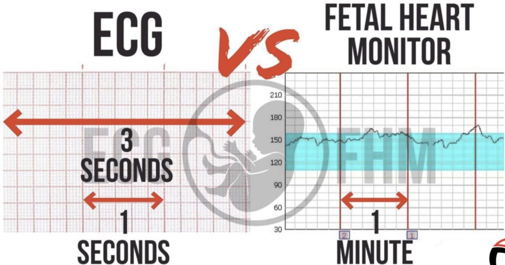 On the other hand, Fetal Monitoring Paper operates under a different set of principles. Each small box on this paper represents 10 seconds in width and a heart rate of 10 beats per minute (BPM) in height. The dark red vertical lines demarcate one minute of time, encompassing 6 small boxes. Fetal monitor data is printed at a rate of 3 centimeters per minute.
